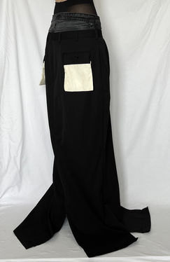 PRODUCT DESCRIPTION Asymmetrical Denim waistband and wool trousers with inside-out fastening, fly details, front drape, and open side legs. The skirt features our signature back pockets. This piece can be styled as a skirt or overskirt. Styling: Sits low on hip